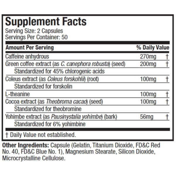 The combination of 100mg of Coleus and caffeine anhydrous helps rev up your metabolism and boost fat-burning potential.